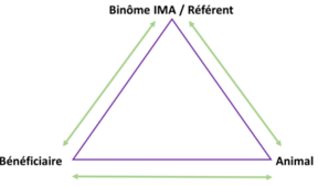 Lors d’un échange avec un professionnel de santé et son patient, l’attention est focalisée sur le patient. Parfois, cette configuration fige les échanges et limite la progression de la personne. L’arrivée d’un animal dans ce duo permet de détourner l’attention. L’animal apaise par sa présence, par le fait qu’il n’attend rien des personnes. « L’animal accepte les humains pour ce qu’ils sont pas pour ce qu’ils devraient être » (B. Levinson). Les liens qui s’instaurent entre les différents protagonistes deviennent propices aux échanges et aux progrès des bénéficiaires. Ces liens sont décrits par Véronique Servais, psychologue et professeur d’anthropologie en Belgique, comme une relation triadique. Le trio, formé par le bénéficiaire, l’animal et le zoothérapeute (ou le binôme IMA/référent) offre alors de nouvelles perspectives pour permettre une évolution physique et/ou psychologique du patient.